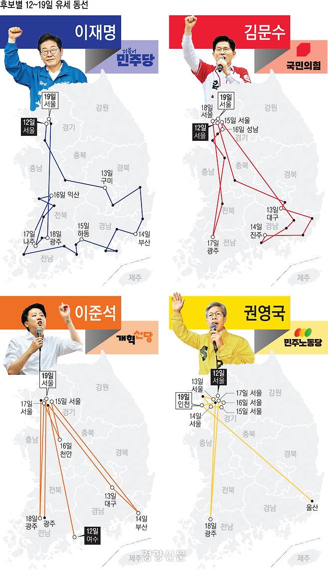 제21대 대통령 선거 공식 선거운동이 시작된 지난 12일부터 19일까지 8일 간 동선을 들여다보면 각 후보의 선거 전략이 보인다. 주요 후보 4명의 이 기간 방문지와 특징을 분석한 결과, 이재명 더불어민주당 후보는 ‘U자 국민통합형’ 동선을 그렸다. 김문수 국민의힘 후보의 동선은 ‘안방사수형’, 이준석 개혁신당 후보는 ‘학식 도장깨기형’, 권영국 민주노동당 후보는 ‘농성장 연대형’으로 요약됐다.