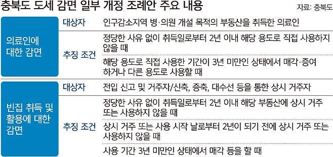 충북 인구감소지역에서 병·의원 설립을 위해 부동산을 취득하는 의료인이나 빈집을 사는 1가구 1주택자 등에 취득세가 전액 면제된다.