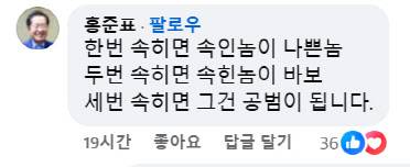 [이데일리 박지혜 기자] ‘파란 넥타이’의 홍준표 전 대구시장은 “한번 속이면 속인 놈이 나쁜 놈. 두 번 속이면 속인 놈이 바보. 세 번 속이면 그건 공범이 된다”라고 했다.