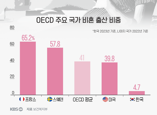 국내 비혼 출산 비중은 2023년 기준 4.7%. 한 해 태어난 아기 백 명 중 다섯 명도 채 되지 않습니다.
