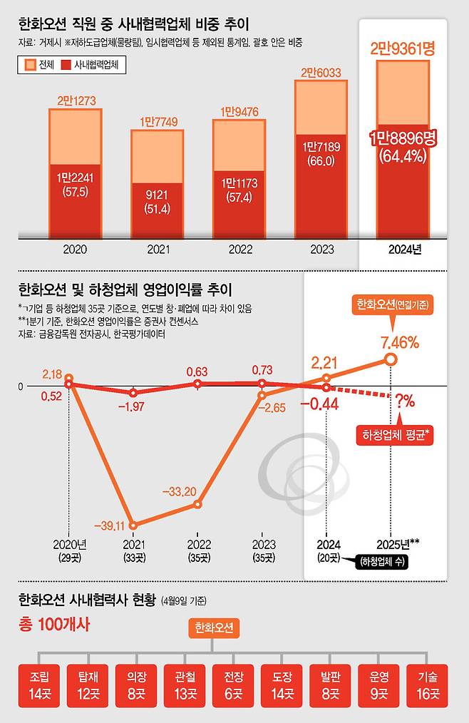 19일 한겨레가 한화오션 하청업체 경영실적을 분석한 결과, 지난해 한화오션은 2379억원의 영업이익을 올린 반면 하청업체(20곳)의 평균 영업이익률은 마이너스였다. 원청업체는 적자에서 벗어나 호황까지 내다보고 있지만 하청업체는 여전히 어려움을 호소한다.