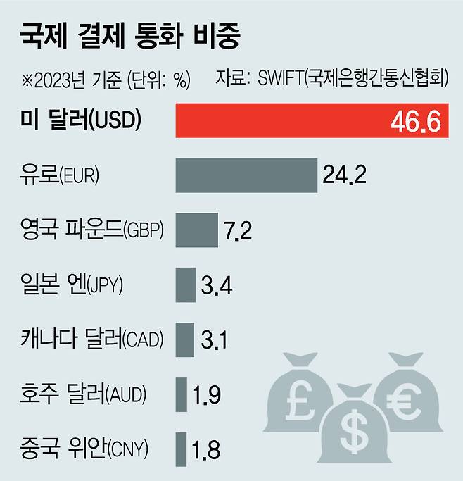 적어도 현시점에서는 달러가 지닌 막강한 범용성이 ‘포스트 달러화’ 논의를 무색하게 한다. 2024년 기준 전 세계 외화보유액에서 미국 달러화 보유 비중은 57.8%로 다음 순위인 유로화 19.8%, 엔화 5.8%에 비해 압도적으로 높다. 물론 연간 단위로 볼 때 달러가 차지하는 비중은 조금씩 낮아지고 있는 것은 분명하나 2위권과의 격차는 아직 큰 편이다.