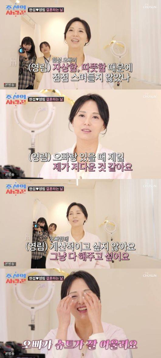 정영림은 심현섭과 결혼을 결심하게 된 계기에 대해 “자연스럽게 결심하게 된 것 같다. 되돌아가면서 생각해 보니까. 오빠의 자상함, 따뜻함 때문에 점점 스며들지 않았나. 오빠는 항상 저를 웃게 해준다. 오빠랑 있을 때 제일 제가 저 다운 것 같다. 보이는 모습으로만 보면 결혼을 안 하려고 할 것이다. (혼수도 내가 다 했다) 계산적이지 않고 그냥 다 해주고 싶다”라며 깊은 애정을 드러냈다.