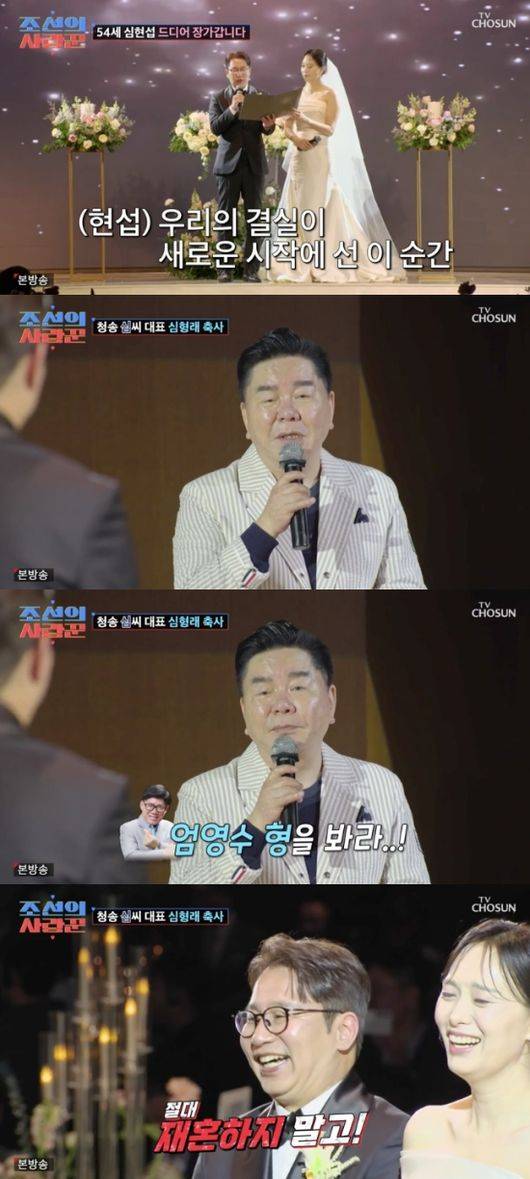 드디어 두 사람의 결혼식이 시작되었다. 심현섭은 떨리는 마음으로 식장으로 들어갔고 두 사람의 결혼에 많은 이들의 축하가 쏟아졌다. 청송 심씨 23대손 심형래의 축사가 시작되었다. 김국진은 “평범한 말을 하지는 않을 텐데”라며 걱정스러운 마음을 드러냈다. 심형래는 “길게 말할 필요 없이 엄영수 형을 봐라. 나쁘다는 게 아니지만. 50살 넘어 결혼하는데 재혼하지 말고 오래오래 행복하게 아주 잘 살았으면 좋겠다”라고 말해 결혼식장을 뒤집어놓았다.