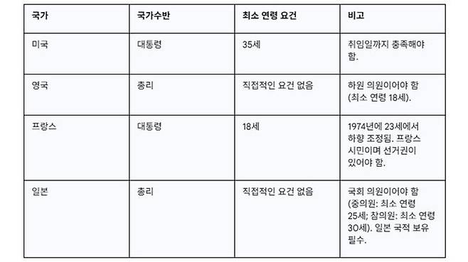 다른 국가들은 대선 출마 연령 제한이 우리나라보다는 낮은 편입니다.