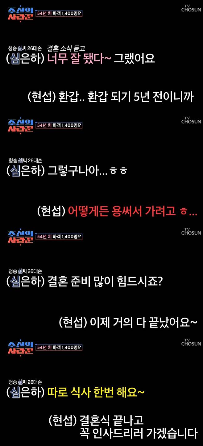 심현섭은 "아주 참하고 착하고 절 보듬어준다"라며 정영림을 자랑했고, 심은하는 "결혼 준비 많이 힘들죠. 따로 한번 식사 하자"며 결혼 전 공감을 표하며 축하를 이어갔다.