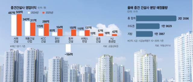 중견 건설사들은 올해 분양 결과에 따라 실적 희비가 엇갈릴 것으로 내다보고 있다. 부동산R114에 따르면 시공능력평가 10~30위 건설사들이 올해 전국에서 공급 예정인 아파트(단독 시공 기준) 물량은 약 3만 3600가구다. 건설사별로는 대방건설이 5467가구로 가장 많고 이어 우미건설(4711가구), 계룡건설산업(3069가구) 등의 순이다. 이중 수도권을 제외하면 약 절반가량인 1만 4000가구가 부산·대구·울산 등 지방에 몰려있는 것으로 집계됐다.