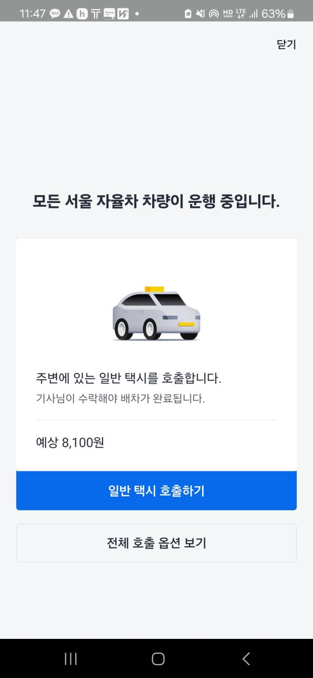 30분 동안 목적지 설정을 바꿔가며 호출을 시도하자 ‘서울 자율차’ 항목이 모범택시 호출 항목 아래에 나타났다. 서둘러 호출을 시도했지만 무의미했다. 화면에는 “모든 서울 자율차가 운행 중이다”라는 글이 나왔다. 1시간을 더 투자해 호출을 시도했지만 결국 자율주행 택시 잡기에 실패했다.