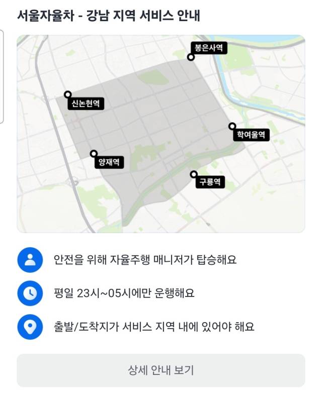 지난달 22일 저녁 11시 서울 강남의 신논현역. 지난해 9월 26일부터 서울 강남구 일대에서 운행 중인 자율주행 택시를 이용해 보려고 호출에 나섰지만 응답은 없었다. 카카오모빌리티가 운영하는 호출 서비스에는 일반 택시를 부르는 선택지만 노출됐다. 자율주행구역 내 위치해 있는지 수차례 확인하며 반복해 호출 버튼을 눌렀지만 허사였다.