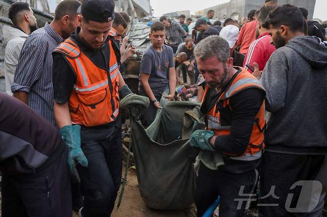 (가자지구 AFP=뉴스1) 이지예 객원기자 = 팔레스타인 구조대가 18일(현지시간) 가자지구 북부 자발리아의 알 사프타위 지역에서 이스라엘 공습으로 숨진 이의 시신을 수습하고 있다. 2025.05.18.