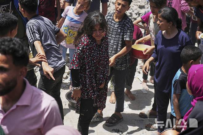 [자발리아=AP/뉴시스] 19일(현지 시간) 가자지구 북부 자발리아의 급식소에 구호 음식을 받으려는 팔레스타인 주민들이 몰려들고 있다. 이스라엘은 지난 10주간 가자지구 내 구호물자 반입을 전면 차단해 왔던 봉쇄를 완화하고 기본 식량 반입을 허용하기로 했다. 2025.05.20.