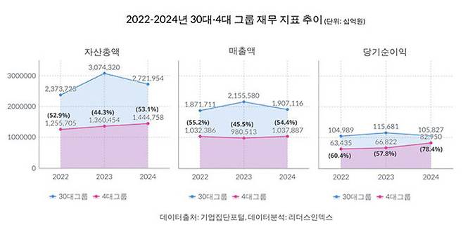 오늘(20일) 리더스인덱스가 자산 기준 30대 그룹과 4대 그룹의 자산 총액·매출액·당기순이익과 직원 수 3년 추이를 비교 분석한 결과 이같이 나타났습니다.
