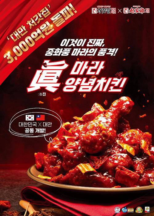 처갓집은 누적 매출 3,000억 원 돌파를 기념해 대만 마스터와 공동 개발한 신메뉴 K-마라, ‘진마라 양념치킨’을 오는 5월 한국과 대만 양국에 동시 출시한다.
