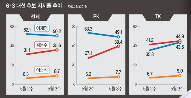 6·3 대선 레이스가 중반전에 이른 20일 각종 여론조사에서 이재명 더불어민주당 후보는 김문수 국민의힘 후보에게 여전히 두 자릿수 격차로 확실한 우위를 보이고 있다. 이 후보 측은 집권 후 절대권력 장악을 노린 행보 중이고, 김 후보 측은 여전히 ‘회고적 프레임’에 갇혀 더딘 상승률을 보인다. 김 후보와 이준석 개혁신당 후보의 막판 단일화 여부, 그리고 투표율이 이번 대선 최대 변수가 될 가능성이 크다.