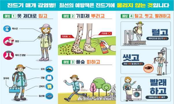 그에 따라 무엇보다 진드기에 물리지 않도록 하는 게 최고의 예방. 이를 위해선 ▲피부 노출 최소화 ▲진드기 기피제 사용 ▲풀밭에 바로 앉지 않기 ▲풀밭에 옷 벗어두지 않기 ▲귀가 후 입었던 옷 바로 세탁하고 즉시 샤워하기 ▲반려동물도 함께 확인하기 등 예방 수칙을 잘 지켜야 한다. 특히 그동안 환자 대부분이 50세 이상 농림축산업 종사자였다는 점에서 농촌 고령층 주민은 더 각별한 주의가 필요하다.