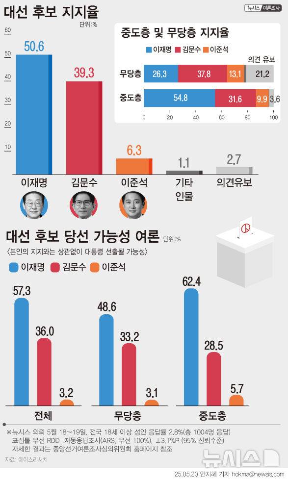 뉴시스가 에이스리서치에 의뢰해 대선 후보 지지도를 조사한 결과 이재명 더불어민주당 후보가 50.6%, 김문수 국민의힘 후보가 39.3%로 나타났다.