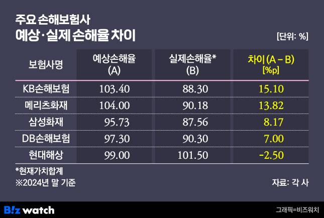 주요 손보사(삼성화재·DB손보·메리츠화재·현대해상·KB손보)의 지난해 말 기준 실제 손해율과 예상 손해율 차이를 살펴보면 예상 손해율을 가장 보수적으로 추정한 곳은 KB손보(15.1%포인트)였습니다.