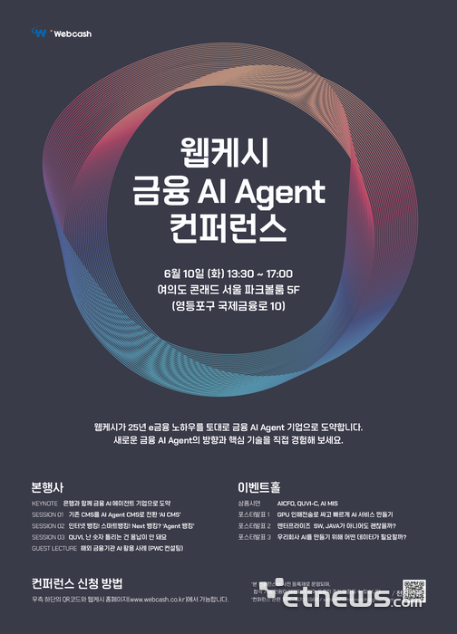'금융 AI 에이전트 콘퍼런스'는 6월 10일 오후 1시 30분부터 5시까지 여의도 콘래드 서울 파크볼룸 5층에서 열린다. 참가 신청은 웹케시 공식 홈페이지 또는 공식 포스터 내 QR 코드를 통해 가능하다.