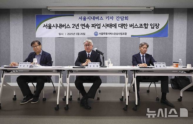 [서울=뉴시스] 김근수 기자 = 김정환(가운데) 서울시버스사업조합이사장이 20일 서울 중구 상연재 별관에서 열린 서울시내버스 2년 연속 파업 사태에 대한 버스조합 입장 발표 기자 간담회에서 발언하고 있다. 2025.05.20. ks@newsis.com