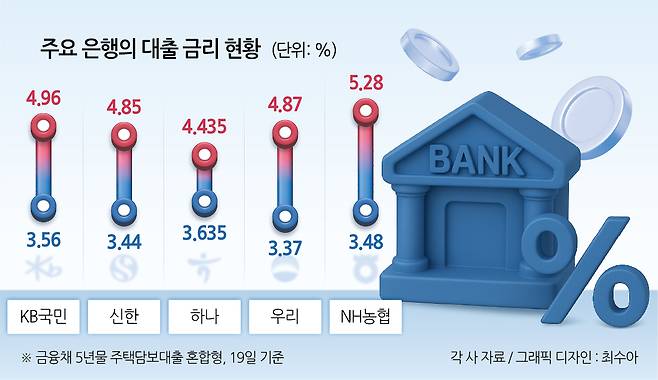 각 은행 공시에 따르면 지난 19일 기준 5대 은행의 주담대 혼합형 대출 금리(금융채 5년물)는 3.37~5.28% 선으로 여전히 4%대에서 주로 취급되고 있다. 이는 기준금리가 연 2.75%, 대출 지표금리인 금융채 5년물(은행·무보증·AAA) 금리가 같은 날 기준 2.815%라는 점과 비교해 한참 높다. 이들 은행의 대표 예금 상품 금리(12개월 만기)는 2.55~2.65% 수준이다.