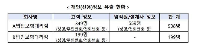 유퍼스트보험에서는 고객 349명 임직원과 설계사 559명 등 908명의 개인정보가 유출됐다. 이중 128명의 고객정보는 가입한 보험계약의 종류, 보험회사, 증권번호, 보험료 등 신용정보주체의 보험가입 내용을 판단할 수 있는 신용정보도 포함된 것으로 확인됐다