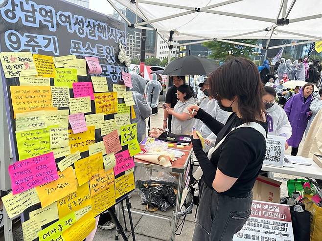 | ▲ 강남역 여성살해사건 9주기 포스트잇 추모 공간 강남역 여성살해사건 9주기 추모행동 참가자가 포스트잇 추모 공간에서 추모 포스트잇을 붙이고 있다. |