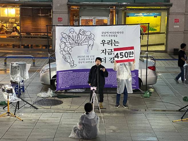 | ▲ 강남역 여성살해사건 9주기 추모행동 여는 발언 강남역 여성살해사건 9주기 추모행동에서 서울여성회 박지아 성평등교육센터장과 서울여성회 페미니스트 대학생 연합동아리(서페대연)의 강나연 운영위원의 여는 발언이 진행되고 있으며, 추모행동 참가자들은 피켓을 들고있다. |