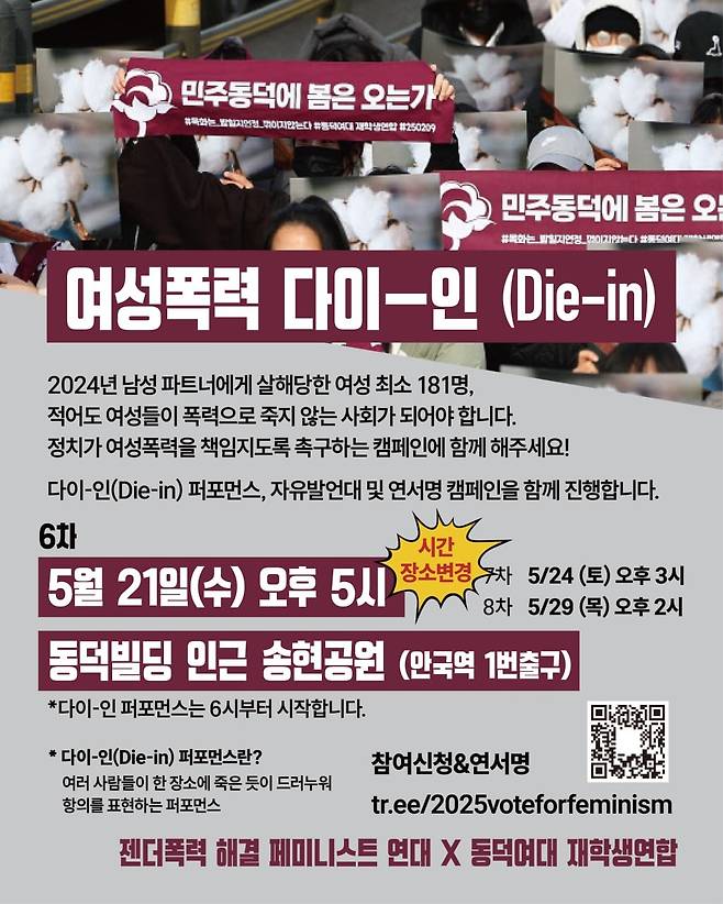 | ▲ '페미연대'가 진행하는 <2025 대선, 여성폭력 해결! 나중은 없다!> 차기 캠페인 일정 '페미연대'는 5월 21일, 수요일 동덕여대 인근 송현공원에서 <2025 대선, 여성폭력 해결! 나중은 없다!> 여성폭력 다이-인(Die-in) 퍼포먼스를 진행할 예정이다. |