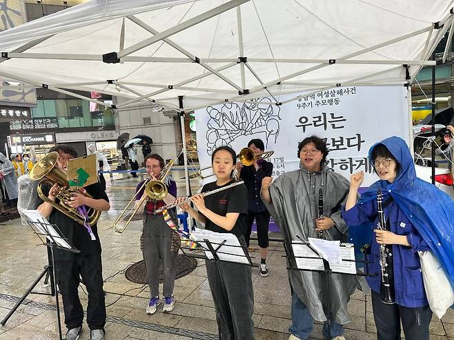 | ▲ 강남역 여성살해사건 9주기 추모행동 캄캄밴드의 여는 공연 강남역 여성살해사건 9주기 추모행동에서 캄캄밴드가 여는 공연을 하고 있다. |