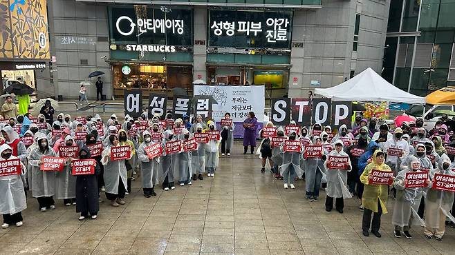 | ▲ 강남역 여성살해사건 9주기 추모행동 단체 사진 강남역 여성살해사건 9주기 추모행동에 참여한 참가자들이 '여성폭력 STOP' 피켓을 들고 구호를 외치고 있다. |