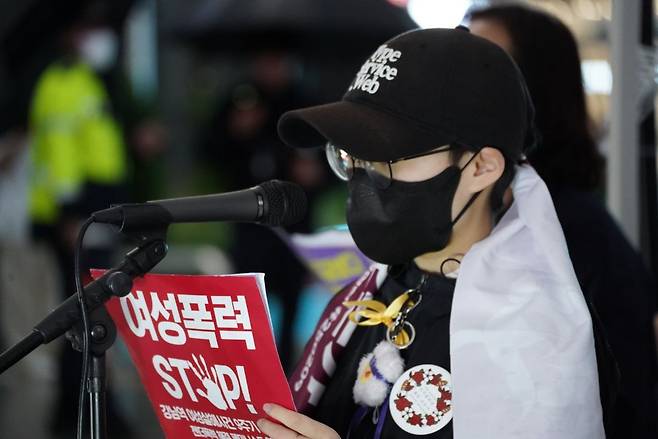 | ▲ 강남역 여성살해사건 9주기 추모행동 발언하는 도담 정의기억연대 활동가 강남역 여성살해사건 9주기 추모행동에서 일본군성노예제 문제해결을 위한 정의기억연대 도담 활동가가 발언을 하고 있다. |