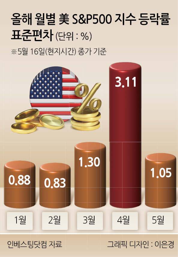 올해 1~4월 S&P500 지수 등락률 표준편차는 1.79%, 지난해는 0.80% 수준을 기록했다. 올해 4월 일별 주가등락률이 올해 1~4월, 지난해 전체 대비 각각 1.74배, 3.89배 더 컸던 셈이다.