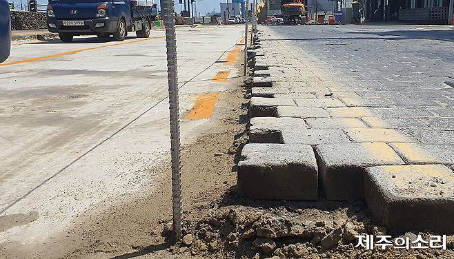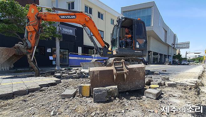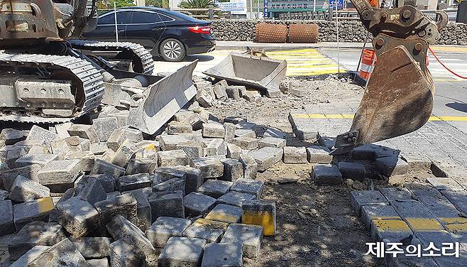 제주시는 동문시장 방향 차로의 사괴석을 우선 걷어내 임시 도로를 만들었다. 이어 용진교 방향 도로의 사괴석을 순차적으로 제거하고 있다.
