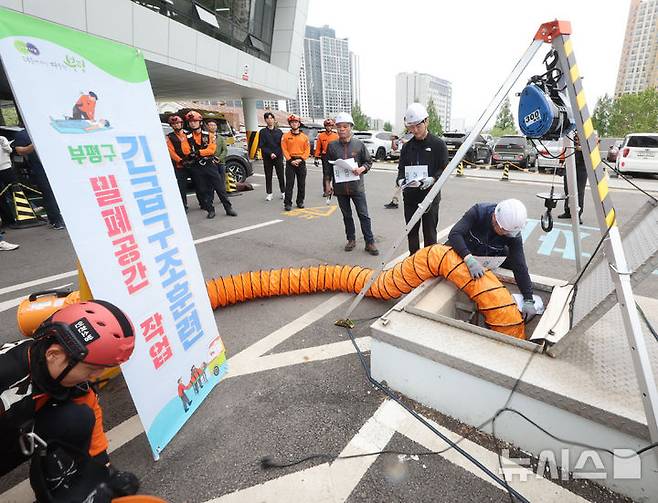 [인천=뉴시스] 전진환 기자 = 밀폐공간 작업 긴급구조훈련이 실시된 20일 오전 인천 부평구 부평남부체육센터에서 부평구청 관계자가 밀폐공간의 유해가스 배출작업을 하고 있다. 2025.05.20. amin2@newsis.com