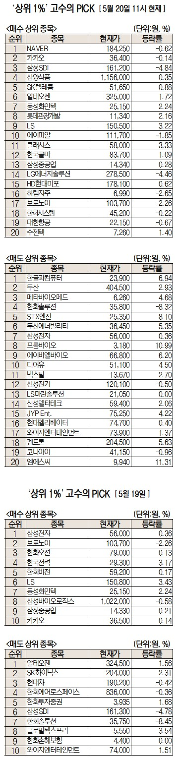 이날 미래에셋증권에 따르면 미래에셋증권 주식 거래 고객 중 최근 1개월간 투자수익률 상위 1%에 해당하는 ‘주식 초고수’들이 오전 11시까지 가장 많이 사들인 종목은 네이버다.
