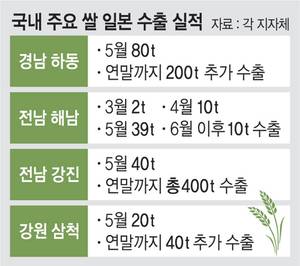 전남 강진군 농협통합RPC(미곡종합처리장)에서도 오는 26일 40t 선적을 시작으로 총 400t이 10차례에 걸쳐 일본 수출길에 오른다. 강원 삼척에서는 지난 13일 ‘삼척동자 맑은쌀’ 20t이 일본에 처음 수출됐다. 삼척동자 맑은쌀은 올해 40t이 추가 수출될 예정이다.