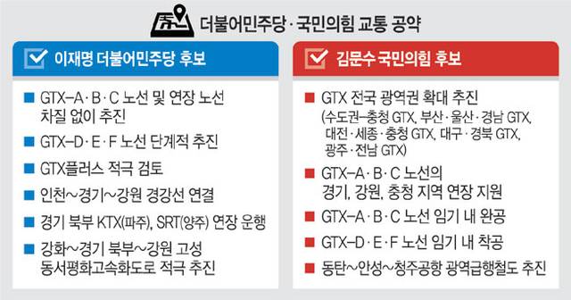 20일 각 당 중앙선거대책위원회에 따르면 경기지사 출신인 두 후보는 공통적으로 수도권 표심을 얻기 위해 GTX 연장·확대를 공약했다. 이 후보는 “수도권 주요 거점을 1시간 경제권으로 연결하겠다”고 밝혔다. GTX A·B·C 노선은 지연되지 않게 추진하고, 수도권 외곽과 강원까지 연장도 적극 지원하겠다는 구상이다. GTX D·E·F 등 신규 노선에 대해서는 지역 간 수요와 효율성을 고려해 단계적으로 추진하고, 경기도가 제안한 수도권 전역을 평균 30분대 생활권으로 연결하는 GTX플러스 노선도 적극 검토하겠다고 했다.