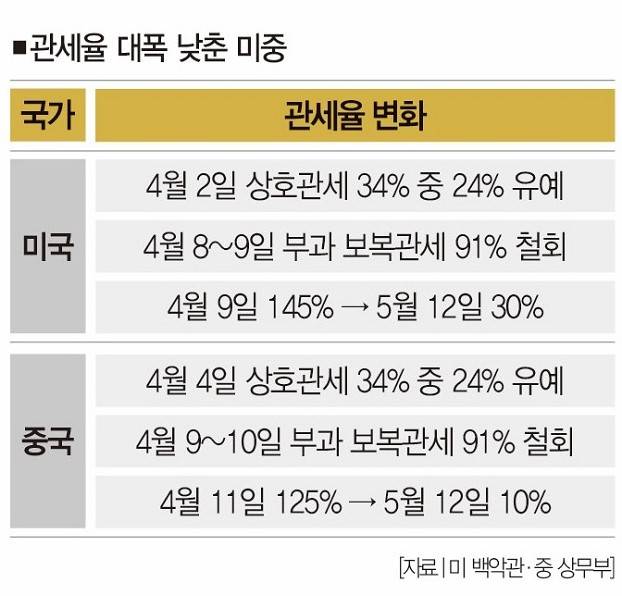 그로부터 4일 후엔 미중 고위급 무역협상의 결과가 나왔다. 미국은 4월 2일 발표한 상호관세 34% 중 24%를 90일간 유예하기로 했다. 8~9일 부과한 총 91%의 보복성 관세는 없앴다.