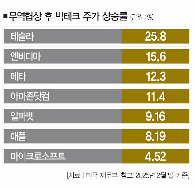 특히 '매그니피센트7'이라 불리는 미국의 거대 기술기업(빅테크) 7개의 주가가 일제히 상승했다. 시가총액 1위인 마이크로소프트(MS)의 주가는 7일 433.35달러에서 8일 438.17달러로 1.1% 뛰었다. 미국과 중국이 보복관세 철회를 발표한 12일에도 2.4% 상승하며 449.26달러로 올랐다.