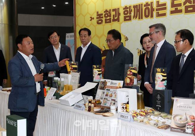 김용래(왼쪽) 한국양봉농협조합장이 20일 농협 본관에서 열린 '농협과 함께하는 도심 속 꿀벌이야기' 행사에서 참석자들에게 꿀벌 제품 등을 설명하고 있다.