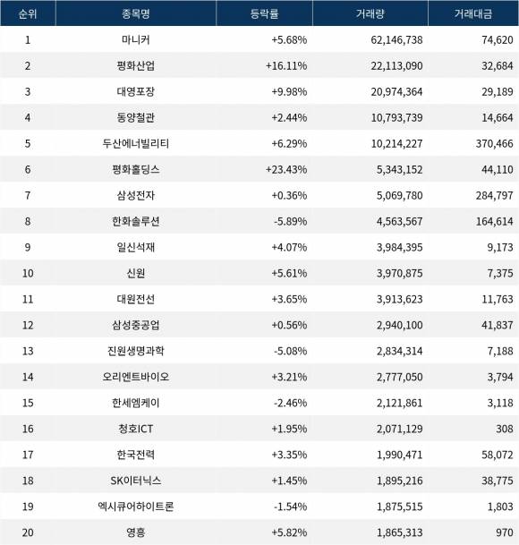 한편 거래량 상위 20위권 종목들은 대원전선(006340) ▲3.65%, 삼성중공업(010140) ▲0.56%, 진원생명과학(011000) ▼5.08%, 오리엔트바이오(002630) ▲3.21%, 한세엠케이(069640) ▼2.46%, 청호ICT(012600) ▲1.95%, 한국전력(015760) ▲3.35%, SK이터닉스(475150) ▲1.45%, 엑시큐어하이트론(019490) ▼1.54%, 영흥(012160) ▲5.82% 등의 성적을 기록했다.