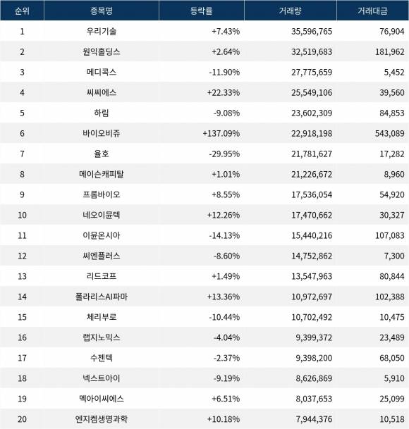한편 거래량 상위 20위권 종목들은 이뮨온시아(424870) ▼14.13%, 씨엔플러스(115530) ▼8.60%, 리드코프(012700) ▲1.49%, 폴라리스AI파마(041910) ▲13.36%, 체리부로(066360) ▼10.44%, 랩지노믹스(084650) ▼4.04%, 수젠텍(253840) ▼2.37%, 넥스트아이(137940) ▼9.19%, 멕아이씨에스(058110) ▲6.51%, 엔지켐생명과학(183490) ▲10.18% 등의 성적을 기록했다.
