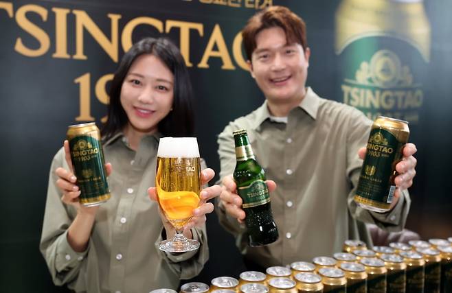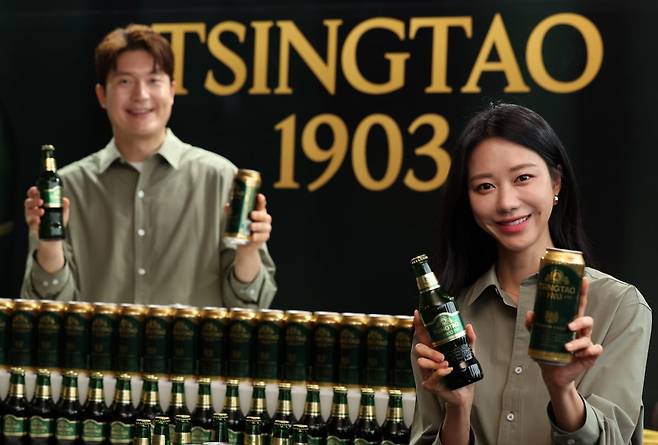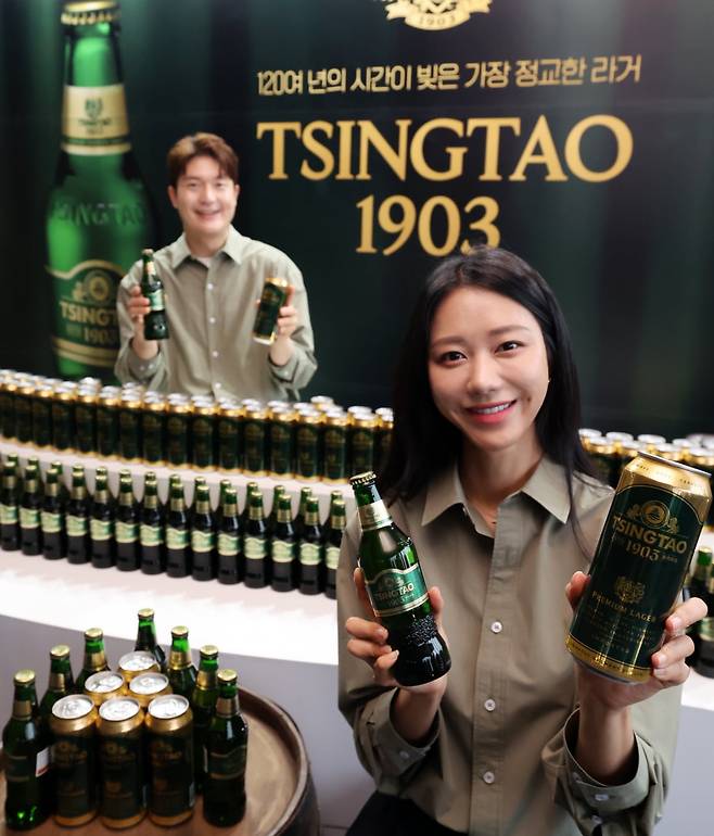 20일 오전 서울 중구 L7 명동 바이 롯데에서 모델들이 '칭따오(TSINGTAO) 1903'을 소개하고 있다. '칭따오 1903'은 브랜드 첫 브루 마스터의 오리지널 레시피와 프리미엄 원료를 사용한 라거 맥주다.