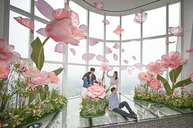 롯데월드타워 전망대 서울스카이가 하늘로 향하는 신비로운 꽃들의 여정을 체험형 공간 '블루밍 유니버스:빅 플라워'로 꾸몄다. 투명 유리 바닥인 스카이데크 위를 분홍빛 꽃들로 연출했으며, 121층에는 지름 5.3m의 빅 플라워를 설치했다. 전시는 오는 8월 31일까지 운영된다.