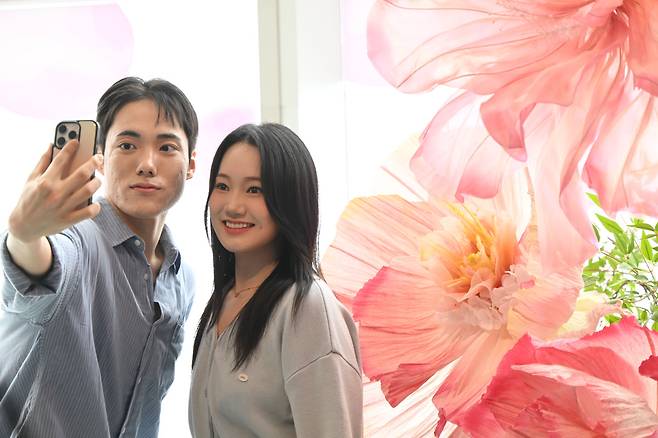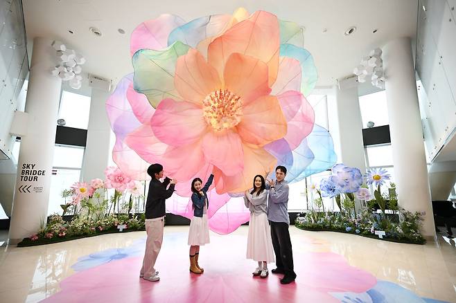 서울스카이 '블루밍 유니버스:빅 플라워'가 열린 20일 서울 송파구 롯데월드타워에서 모델들이 대형 꽃 앞에서 포즈를 취하고 있다.