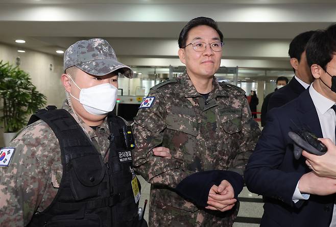 20일 오전 서울 중앙지역군사법원에서 열린 여인형 전 사령관, 문상호 전 정보사령관의 내란중요임무종사, 직권남용 혐의에 대한 공판에는 이 전 사령관이 증인으로 나왔다.