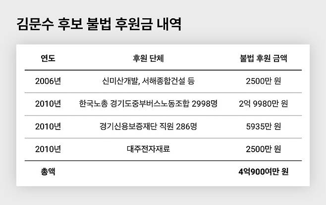 앞서 뉴스타파는 김 후보가 과거 ▲경기신용보증재단 직원 286명으로부터 5935만 원 ▲신미산개발 등으로부터 2500만 원 ▲한국노총 경기도중부버스노동조합 2998명로부터 약 3억 원의 불법 후원을 받은 사실을 보도했다.