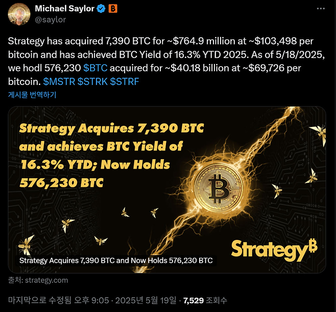 19일(현지시간) 마이클 세일러 스트레티지 의장에 따르면, MSTR은 7390개의 비트코인을 7억6490만달러에 매입했다.