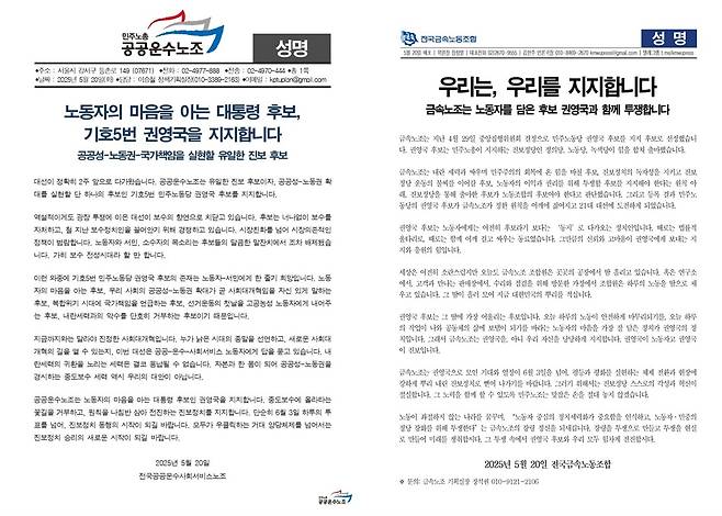 전국민주노동조합총연맹(민주노총)의 산별노조 중 가장 많은 조합원이 소속된 전국공공운수사회서비스노동조합과 전국금속노동조합이 민주노동당 권영국 대선후보의 지지를 선언했다.