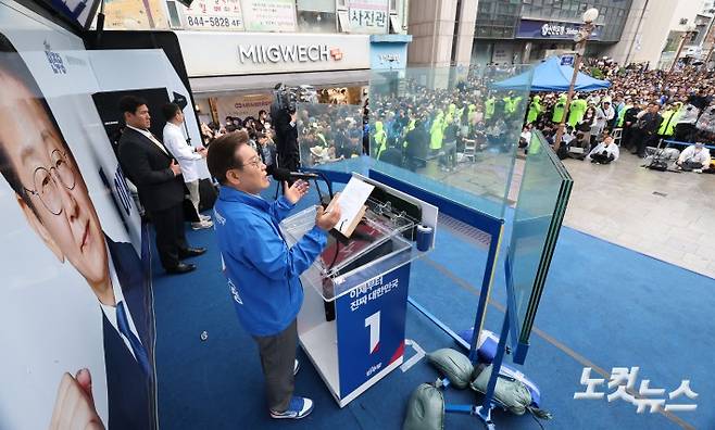 이재명 더불어민주당 대선 후보가 20일 오전 경기 의정부시 태조이성계상 앞에서 열린 유세에 참석해 지지를 호소하고 있다.
